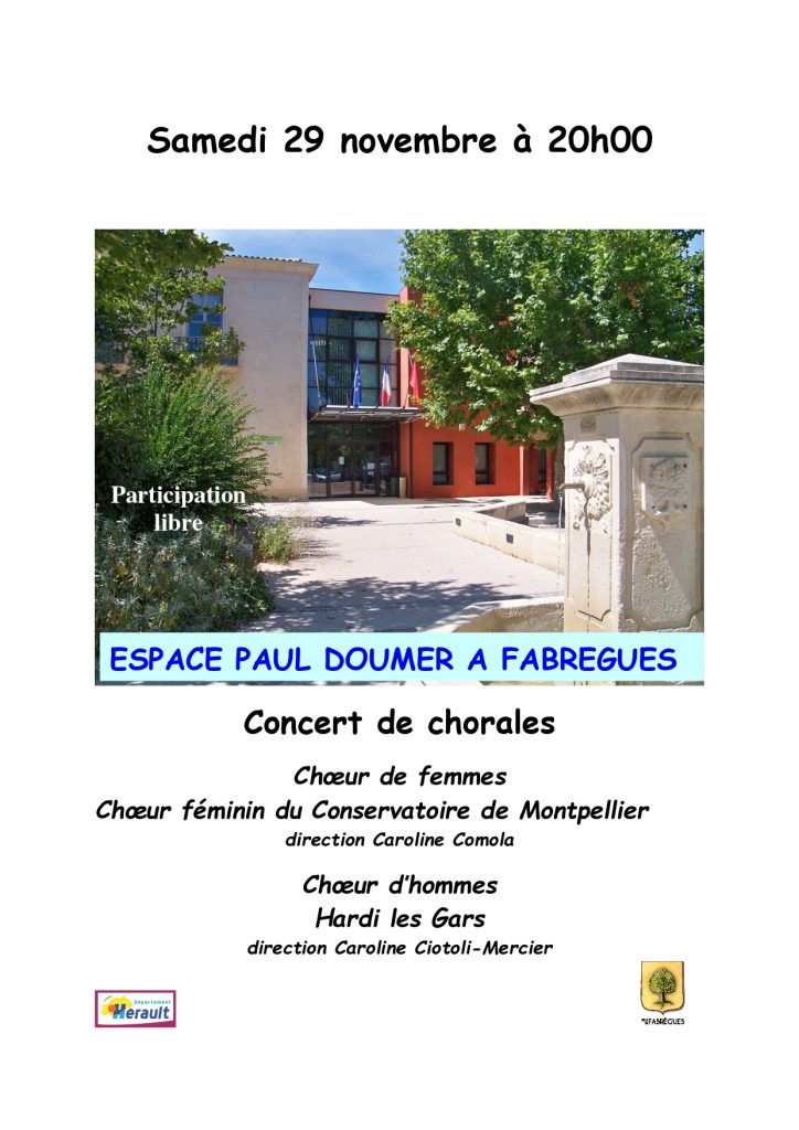 Caroline Comola avec le chœur féminin « Elles » du Conservatoire à Rayonnement Régional de Montpellier vous feront voyager de la musique baroque au XXème siècle en passant par l’univers de la comédie musicale. Dans une seconde partie c’est un répertoire puisé dans la chanson française, l’opérette, les chants en langues régionales que vous proposeront Caroline Ciotoli-Mercier avec le chœur d’hommes « Hardi les Gars ».